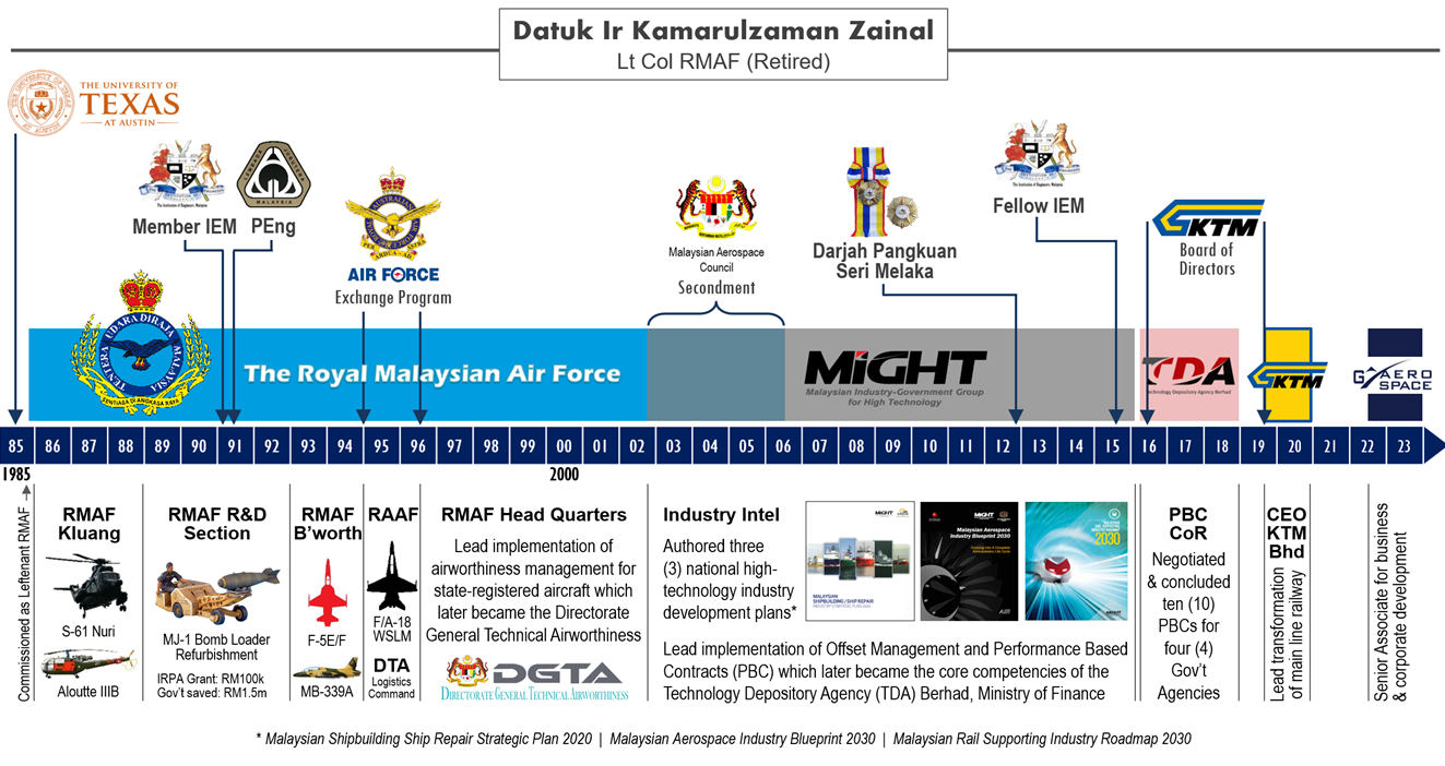 From 2002 to 2016, Kamarulzaman was Senior Vice President of the Malaysian Industry-Government Group for High Technology (MIGHT); an organization under the Prime Ministers’ Department. He was responsible for developing the nation’s strategies for advancement of aerospace, maritime and rail industries as well as pioneering the government initiative on offset (now known as ICP) management and Performance Based Contracts (PBC), currently documented as Treasury Circulars PK 1.7 & PK 1.8 respectively.