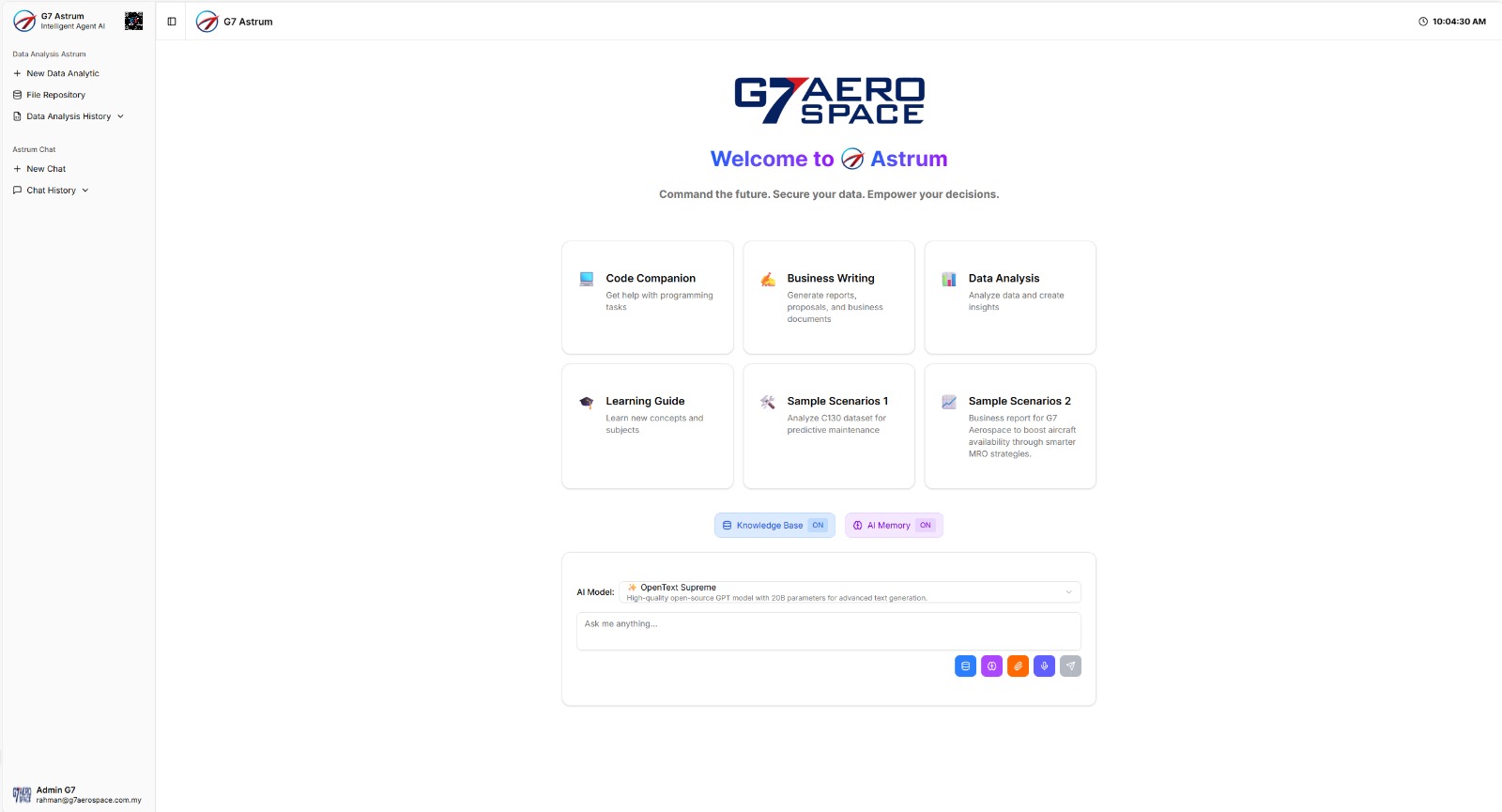 G7 Astrum is purpose-built for aerospace, defense, and enterprise environments where reliability, accuracy, and security are paramount. Its flexible integration capabilities allow seamless deployment across existing digital ecosystems, supporting use cases such as secure knowledge management, cyber threat analysis, operational monitoring, and strategic planning. By leveraging advanced AI technologies, G7 Astrum empowers organizations to achieve higher resilience, faster response times, and sustained technological advantage in an increasingly complex and data-driven landscape.