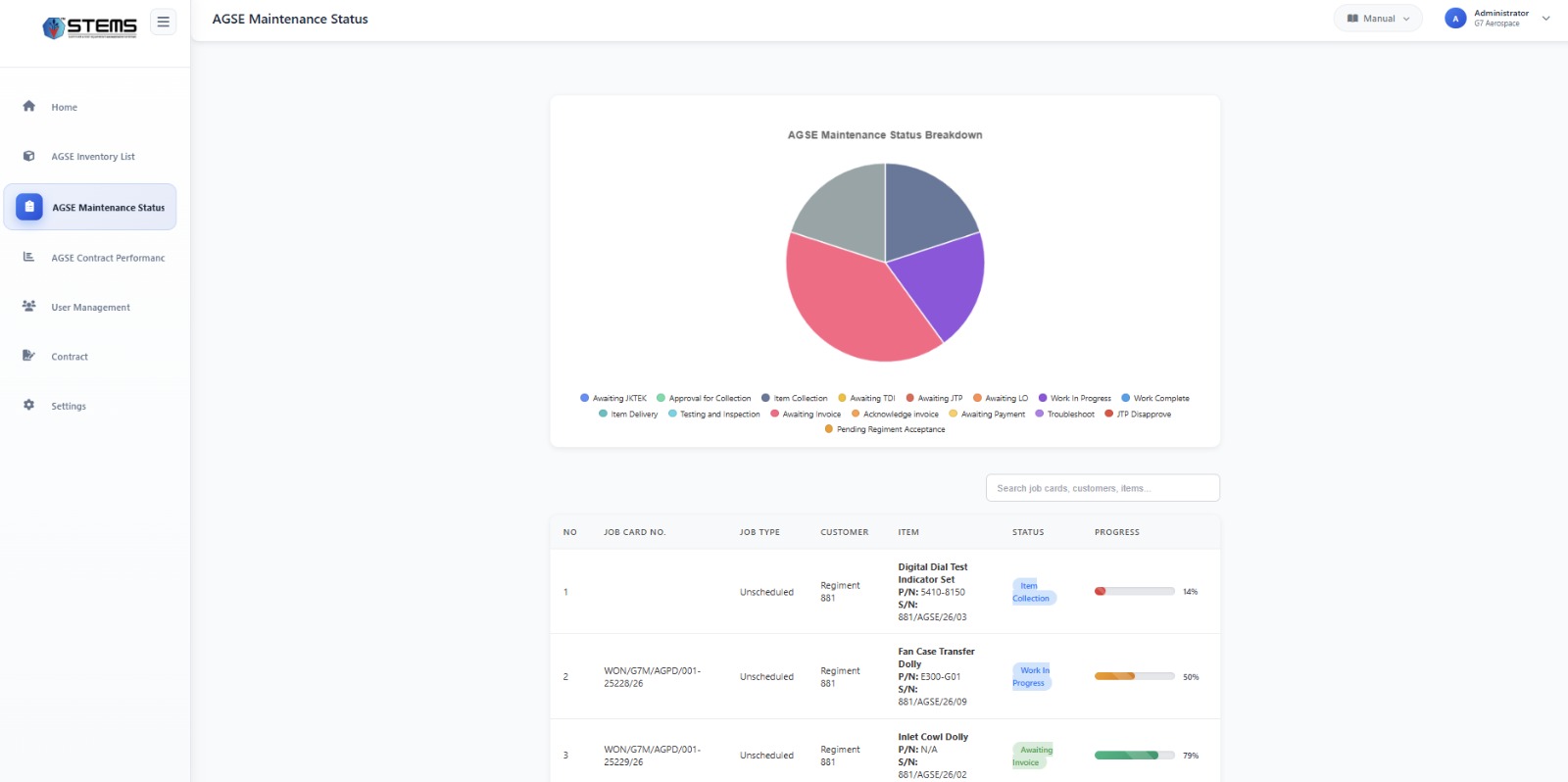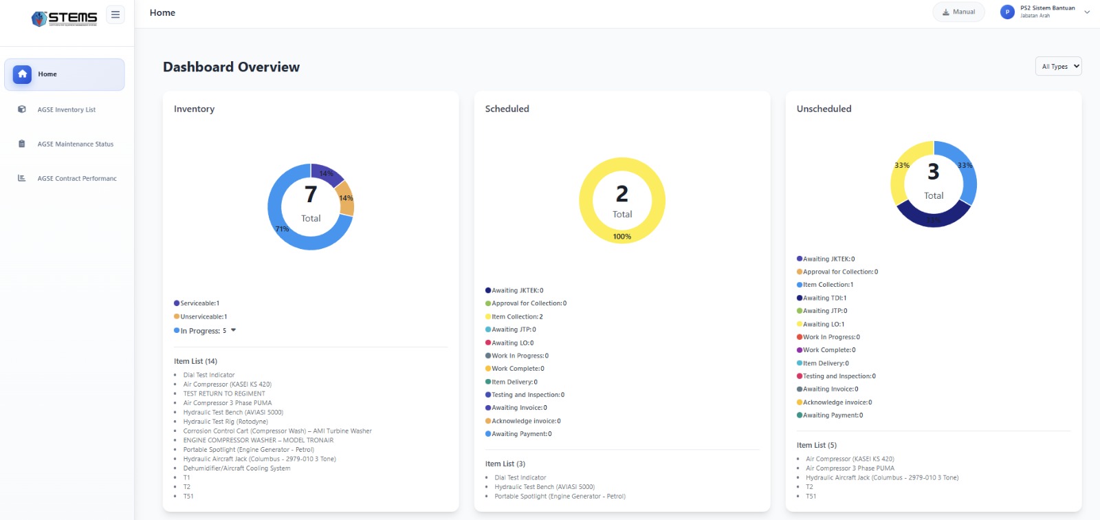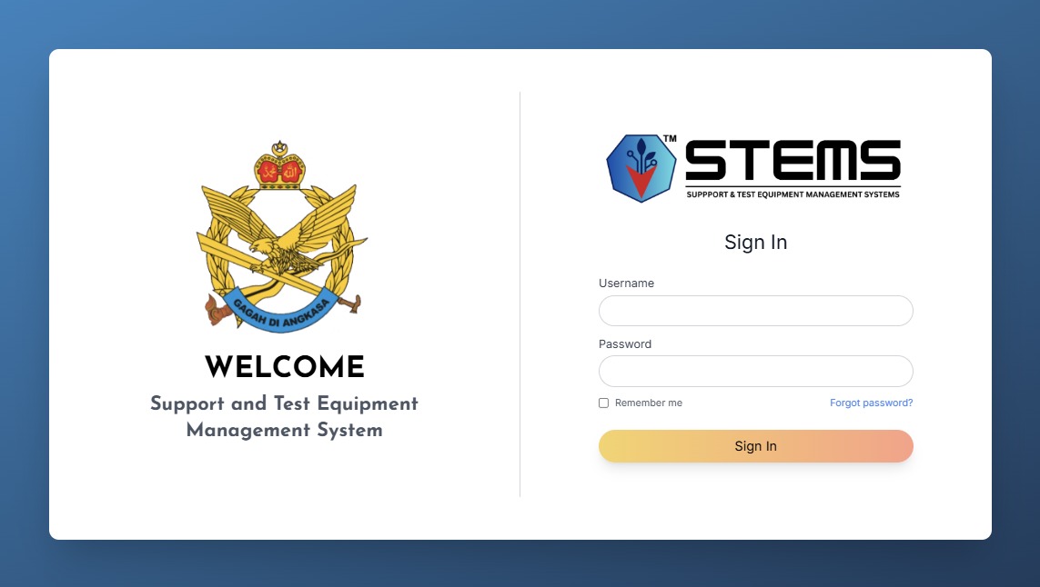 The Support and Test Equipment Management System (STEMS) is designed to provide a centralized and structured platform for managing calibration items, servicing schedules, and lifecycle records of support and test equipment. Through standardized workflows and controlled processes, STEMS ensures that all equipment data is systematically recorded, monitored, and maintained in accordance with organizational and regulatory requirements.This enables users to maintain high levels of operational readiness and compliance.